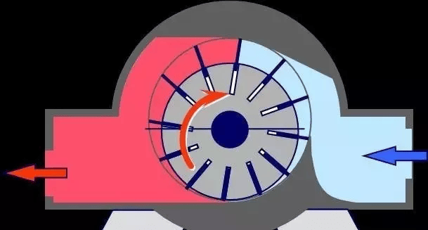 当叶轮高速旋转时,气体随着旋转,在离心力作用下,气体被甩到后面的扩压器中去,而在叶轮处形成真空地带,这时外界的新鲜气体进入叶轮。叶轮不断旋转,气体不断地吸入并甩出,从而保持了气体的连续流动。