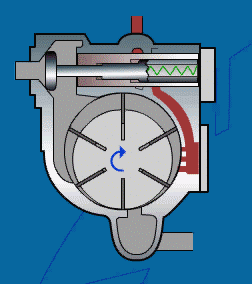 空气经由一过滤器及一调节比例阀而吸入,该调节阀主要用于调节空气缸转子,滑片形成的压力腔。转子旋转相对于气缸呈偏心式运转、阀片安装在转子的槽中,通过离心力将滑片推至气缸壁,高效的注油系统能够确保压缩机的冷却及润滑剂的最小损耗量,在气缸壁上形成的一层薄薄的油膜可以防止金属部件之间直接接触而造成磨损。