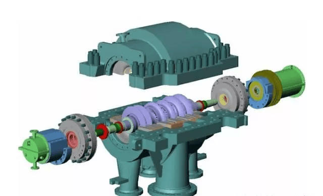 离心式压缩机又称透平式压缩机,主要用来压缩气体,主要由转子和定子两部分组成:转子包括叶轮和轴,叶轮上有叶片、平衡盘和一部分轴封;定子的主体是气缸,还有扩压器、弯道、回流器、迸气管、排气管等装置。