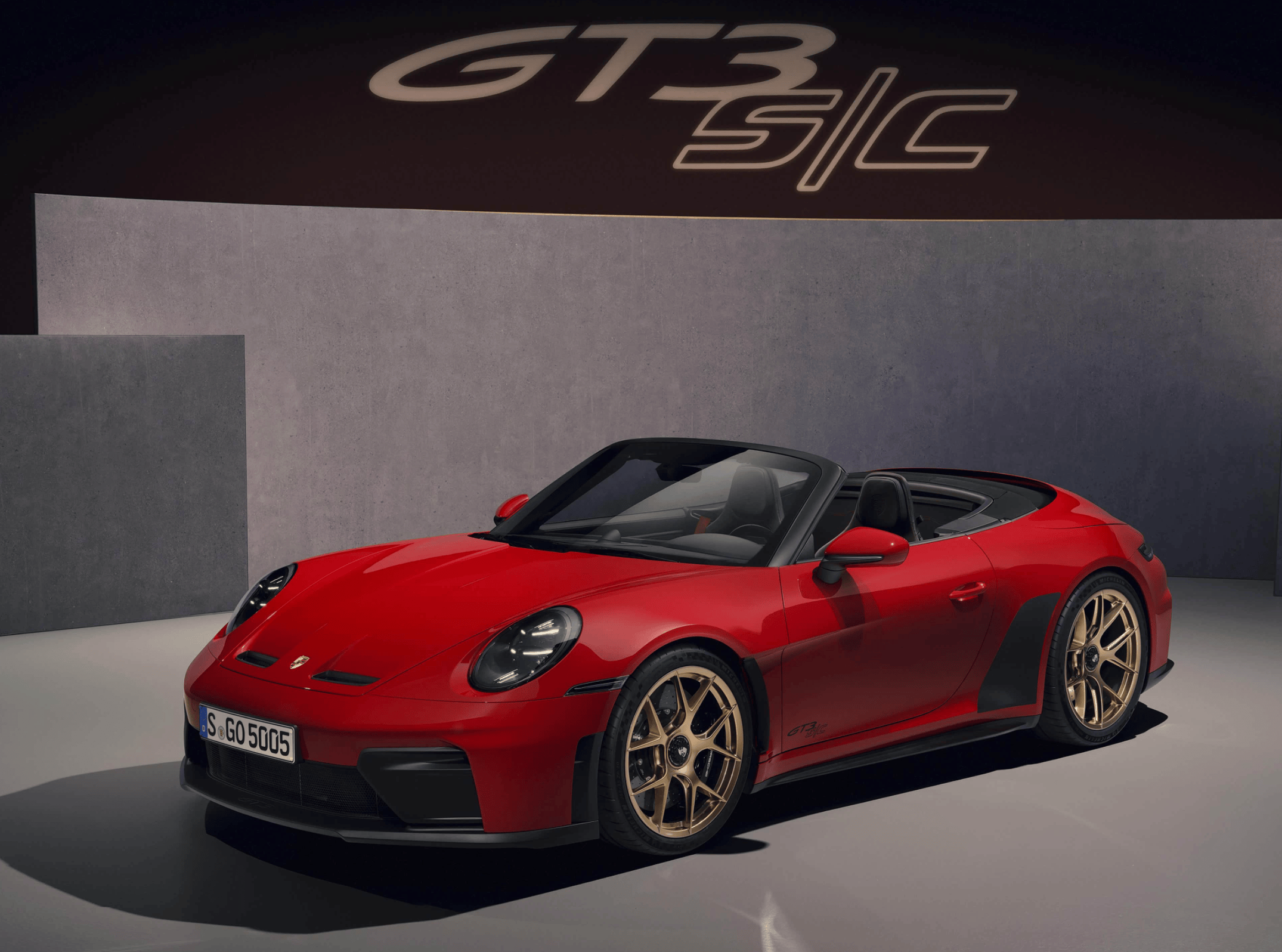 来到车身侧面,从保时捷官方发布的图片来看,保时捷911 GT3 S/C采用了激情红色的车漆涂装,加入了黑色的软顶车篷,这套软顶敞篷开合速度很快,仅需12秒就能完成开启或关闭,而且在行驶状态下也能操作。车身加入了大量优雅流畅的线条勾勒,配备了黑色碳纤维前后翼子板,大量的直立式孔洞设计,并配备了宽体碳纤维侧裙,为了减轻车重,保时捷工程师专门为这台车提供了一套轻量化方案:配备了前20英寸/后21英寸的镁合金中央锁止轮毂(源自于911 S/T),轮毂减重了8.6-9公斤,匹配了255/35 ZR20、315/30 ZR21规格的轮胎,换上了PCCB(保时捷陶瓷复合制动系统),具备更强的抗热衰减能力,适合高强度驾驶。最终整备质量为1507kg,仅比GT3 Touring硬顶重38kg,远低于Carrera S敞篷84kg的增重幅度。